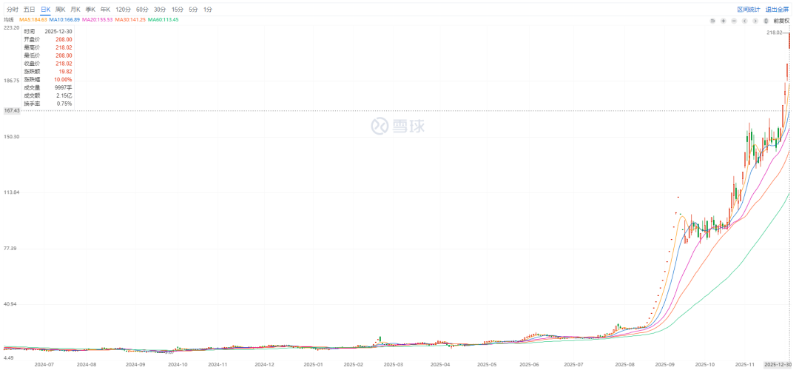 《星岛》了解到,2025年,天普股份的股价从每股约12.43元飙升至218.02元,累计涨幅达1654.79%,被称为A股年度“第二大牛股”(仅次于上纬新材)。