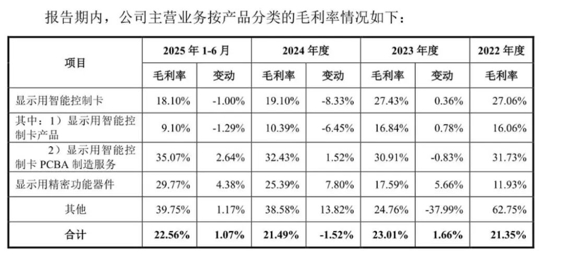 分业务来看,宇隆科技显示用智能控制卡的毛利率各期分别为27.06%、27.43%、19.10%及18.10%,而显示用精密功能器件各期的毛利率分别为11.93%、17.59%、25.39%、29.77%。