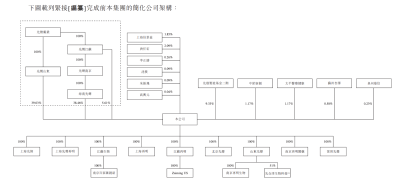 IPO前,先声药业通过其全资附属公司间接控制合共约占先声再明已发行股本总额83.10%的股本所附带的投票权,其中约39.03%由先声山东持有,约38.46%由海南先声持有,及约5.61%由先声江苏持有。