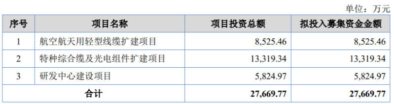 本次IPO,文峰光电拟投入募集资金金额2.77亿元,分别用于航空航天用轻型线缆扩建项目、特种综合缆及光电组件扩建项目及研发中心建设项目。