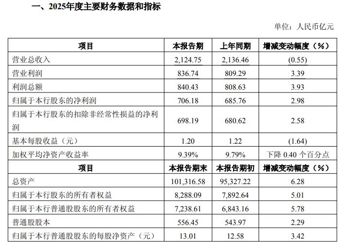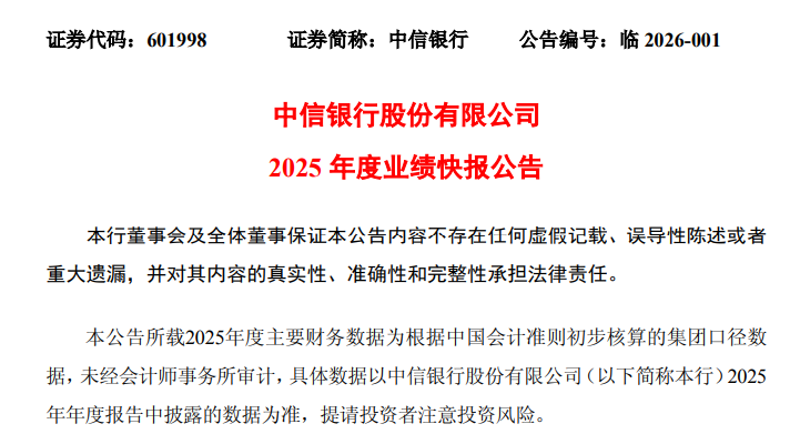 该行表示,公告所载2025年度主要财务数据为根据中国会计准则初步核算的集团口径数据,未经会计师事务所审计,具体数据以其2025年年度报告中披露的数据为准,提请投资者注意投资风险。