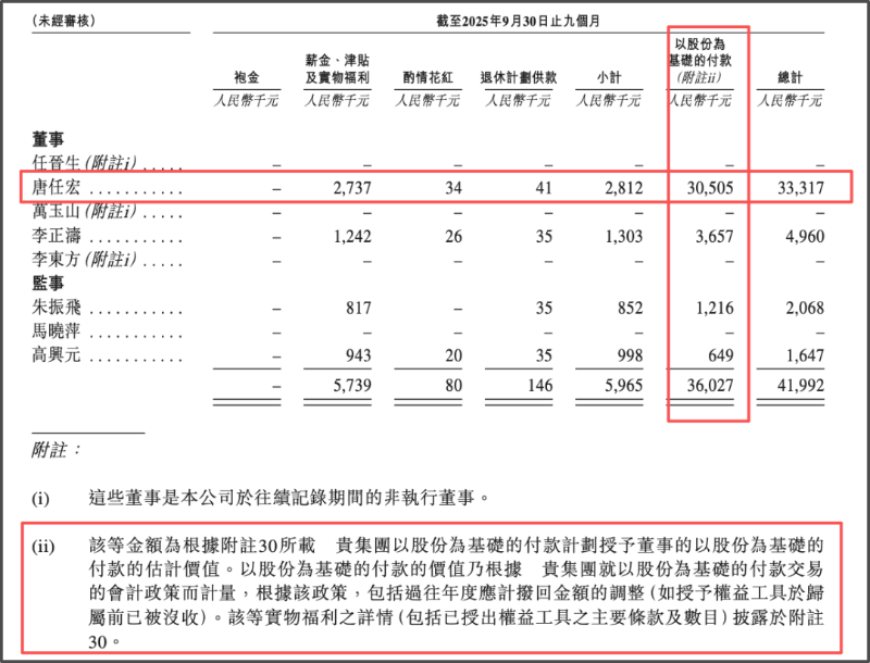 2023-2025年前三季度,唐任宏薪酬分别高达1723.7万元、5685.1万元、3331.7万元,但其中大部分是以股份为基础的付款,分别为811.6万元、5126.8万元、3050.5万元。