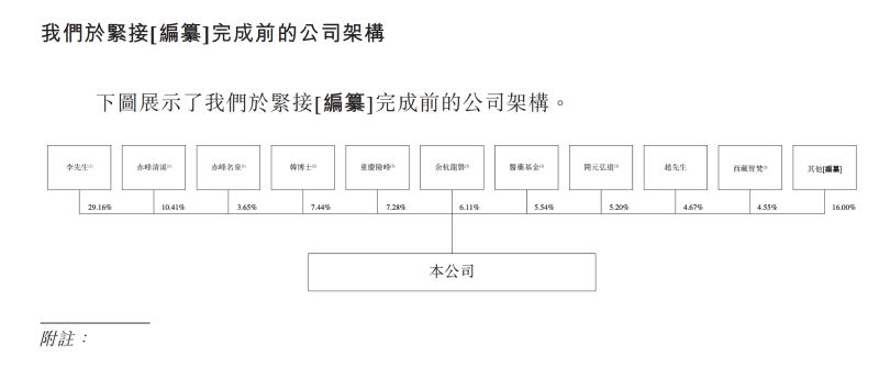 IPO前,李雨亮有权行使公司已发行股本总额约43.22%所附带的投票权,其中包括:李雨亮(以个人身份)拥有公司已发行股本总额约29.16%的权益;及透过赤峰清溪及赤峰名泉控制公司约14.06%投票权,赤峰清溪及赤峰名泉分别持有公司约10.41%及3.65%股份。