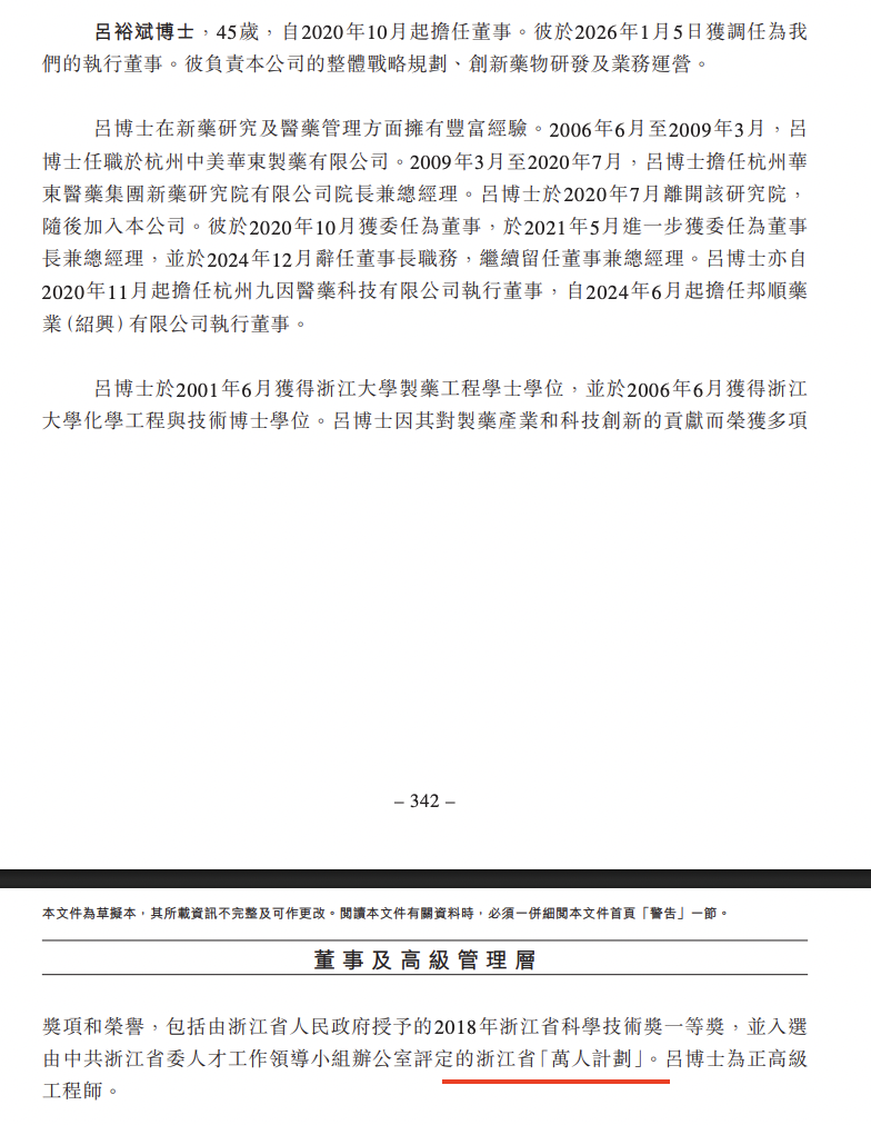 吕裕斌在新药研究及医药管理方面拥有丰富经验。2006年6月至2009年3月,吕裕斌任职于杭州中美华东制药有限公司。2009年3月至2020年7月,吕裕斌担任杭州华东医药集团新药研究院有限公司院长兼总经理。吕裕斌于2020年7月离开该研究院,随后加入邦顺制药。他于2020年10月获委任为董事,于2021年5月进一步获委任为董事长兼总经理,并于2024年12月辞任董事长职务,继续留任董事兼总经理。吕裕斌亦自2020年11月起担任杭州九因医药科技有限公司执行董事,自2024年6月起担任邦顺药业(绍兴)有限公司执行董事。