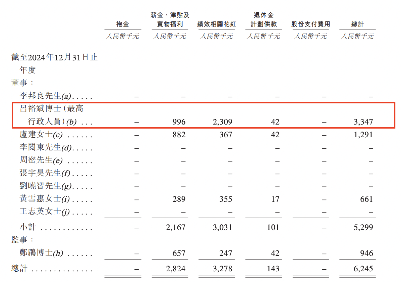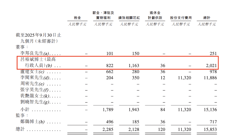薪酬方面,2024年、2025年前9月,吕裕斌薪酬总计分别为334.7万元、202.1万元。