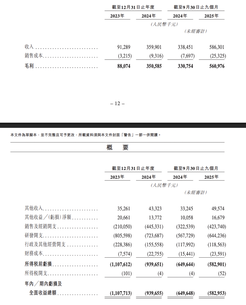 2023年、2024年及2025年前9月,迪哲医药收入分别为9128.9万元、3.6亿元、5.86亿元,年内╱期内亏损及全面收益总额分别为11.08亿元、9.4亿元、5.83亿元,毛利率分别为96.5%、97.4%及95.7%。