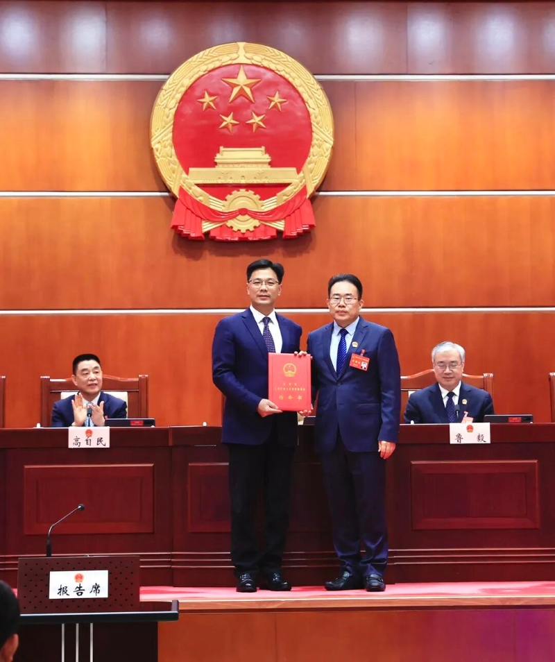 ▲市人大常委会主任戴运龙为新获任命的深圳市副市长、市公安局局长郑泽晖颁发任命书