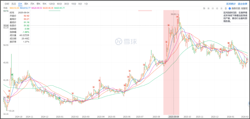 实际上,2025年牧原股份的股价表现已优于行业水平,全年涨幅超过30%,主要受益于生猪出栏量增长和成本控制能力提升。其中,去年9月15日该公司股价一度触及每股58.65元,创近三年新高。