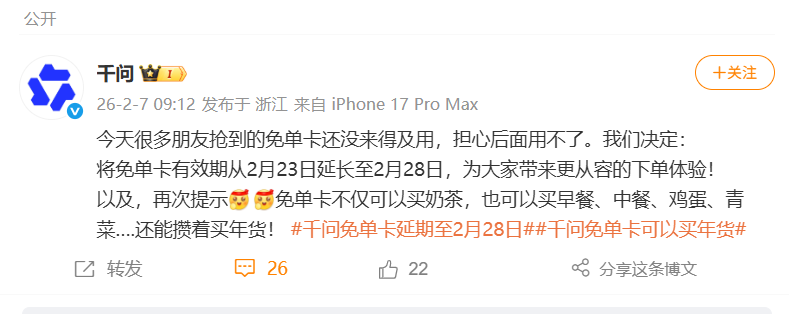 2月6日,千问APP推出“春节30亿大免单”活动,每位用户能获得1张25元免单卡。通过APP下单,可免费点奶茶。距离活动上线仅9个小时,订单量已超过1000万单。