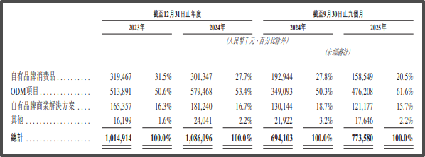 数据显示,2025年前9个月,鹿客科技总收入约为7.74亿元,同比增长11.45%,但增长动力完全依赖ODM业务。分业务来看,期内ODM项目收入同比增长36.41%至4.76亿元,占总收入比例达61.6%,创近年来新高;自有品牌相关业务则全面下滑,其中自有品牌消费品收入下降17.83%至1.59亿元,自有品牌商业解决方案下降6.89%至1.21亿元。