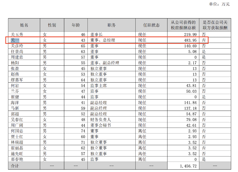 薪酬方面,2024年,关一从公司获得的税前报酬总额为483.95万元,位居董监高首位。而关玉秀税前报酬总额219.99万元。