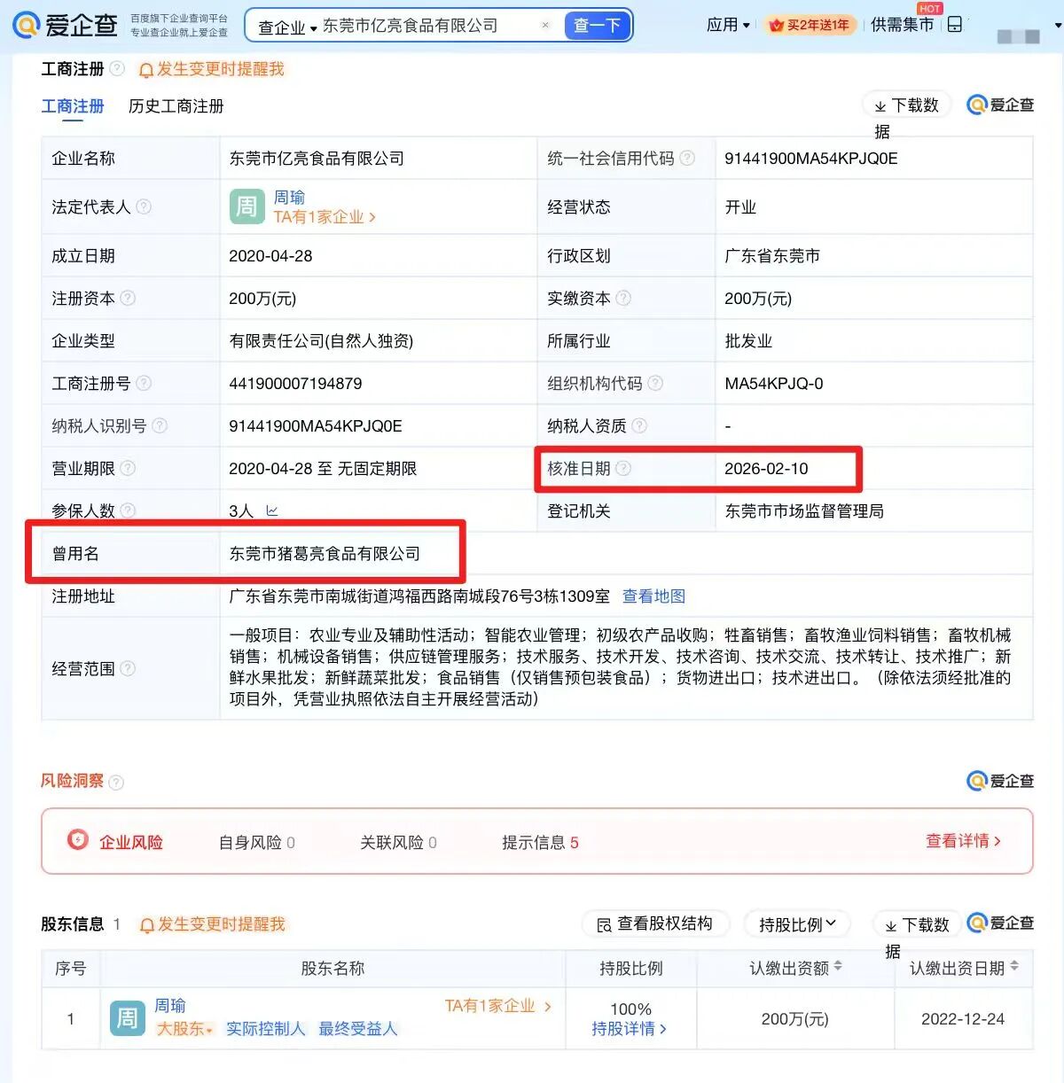 爱企查App显示,2026年2月10日,东莞市猪葛亮食品有限公司已更名为东莞市亿亮食品有限公司。该公司成立于2020年4月,法定代表人为周瑜,注册资本是200万元人民币,经营范围包括农业专业及辅助性活动、智能农业管理、初级农产品收购等,由周瑜全资持股。