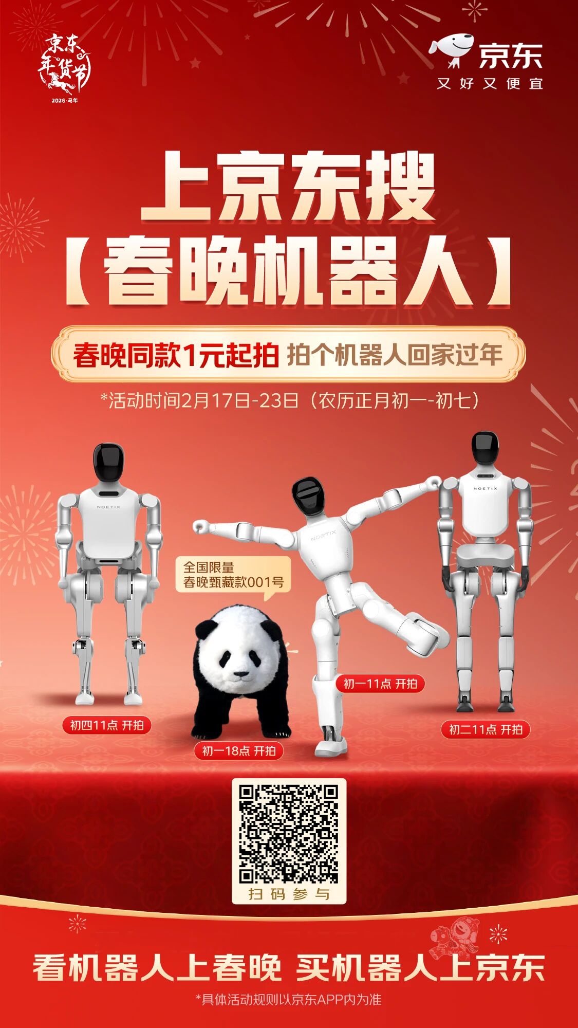 同时,消费者上京东APP搜索“春晚机器人”即可直达活动会场,解锁各类机器人好物及福利。目前,宇树科技、银河通用、魔法原子、松延动力这些春晚合作品牌,以及智元、众擎等行业知名机器人品牌已齐聚京东。多家品牌选择在京东进行全球新品首发,产品覆盖生活助手、教育陪伴、养老辅助、技术开发及工业应用等多元场景,满足不同消费需求。
