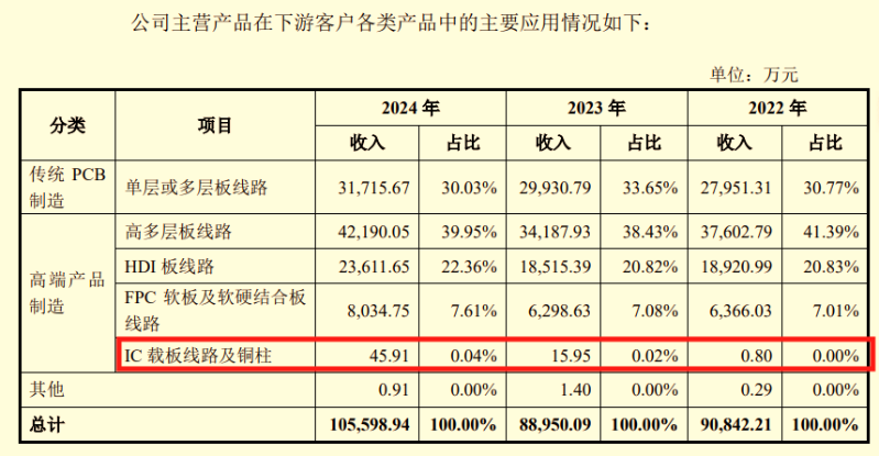 初源新材回复深交所的问询函显示,其用于高多层板、HDI板(高密度互连板)等相对高端的产品收入呈逐年上升趋势,但代表最先进技术的IC载板产品仍未能突破市场壁垒。2024年,用于IC载板的感光干膜收入仅45万元,占收入比仅0.04%。