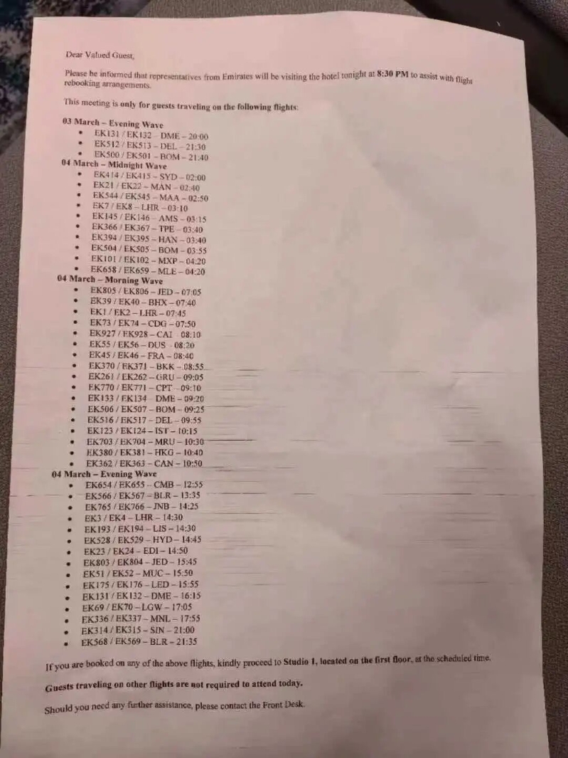 当地时间3月2日晚上开始,迪拜机场开始逐渐恢复运营,阿联酋航空也逐步投入运力,恢复各地航班,记者从滞留迪拜的中国游客获得的一份航班计划表显示,从3月3日到3月4日阿航实际上只有45个航班恢复运行。