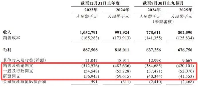 2023年、2024年及2025年前三季度,汉方制药的销售及营销开支,分别为5.1亿元、4.8亿元及4.2亿元,占同期总收入的比例,分别达到48.7%、48.6%及52.3%。