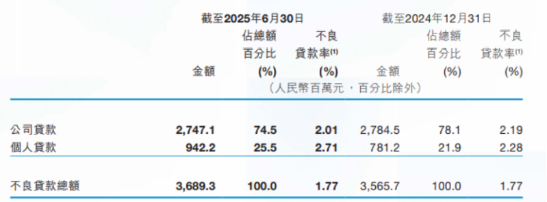 可以看到,晋商银行个人贷款不良贷款率由截至2024年12月31日的2.28%上升至截至2025年6月30日的2.71%。