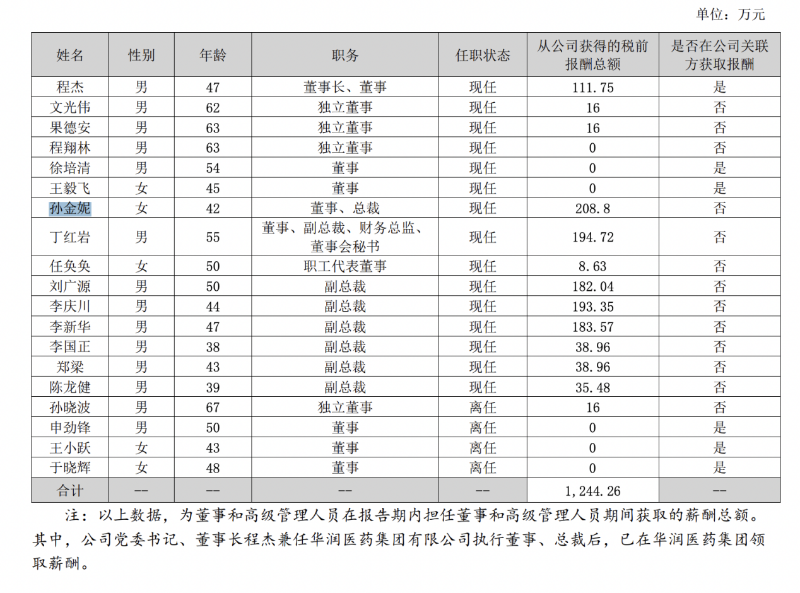 而公司董事长、董事程杰薪酬为111.75万元。另外,程杰兼任华润医药集团有限公司执行董事、总裁后,已在华润医药集团领取薪酬。