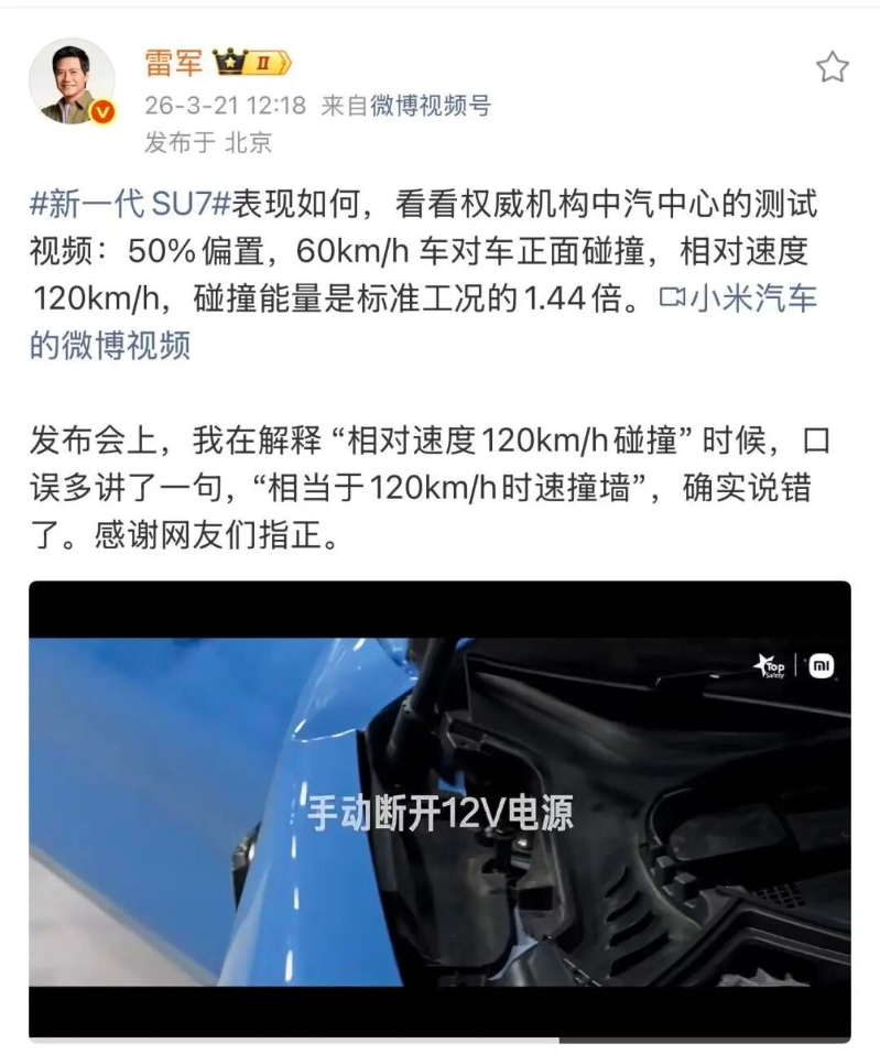 3月21日午间,小米集团创始人、董事长兼CEO雷军发文称,“发布会上,我在解释‘相对速度120km/h碰撞’时候,口误多讲了一句,‘相当于120km/h时速撞墙’,确实说错了。感谢网友们指正。 ”