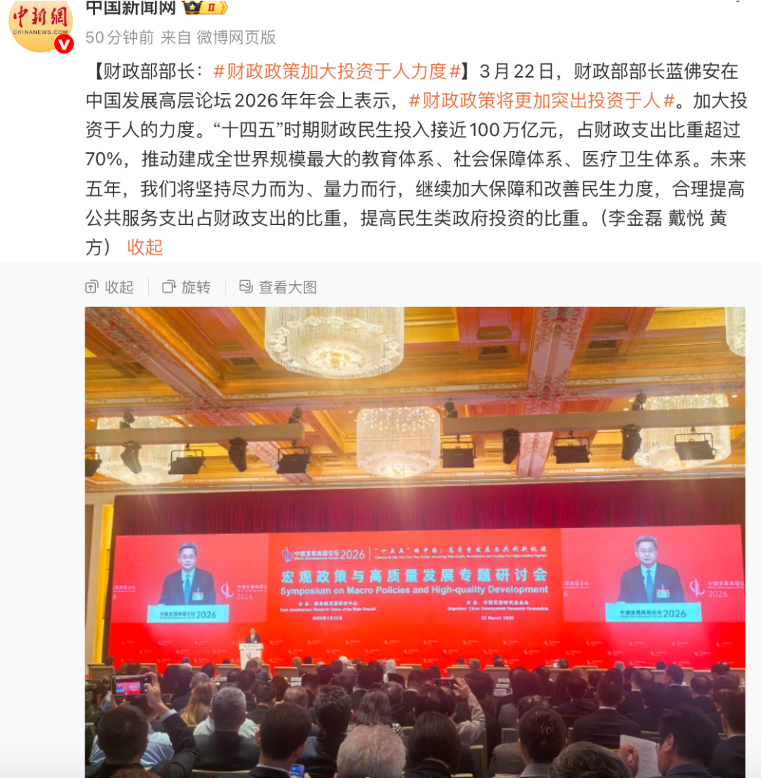 财政部部长蓝佛安在中国发展高层论坛2026年年会上表示,财政政策将更加突出投资于人。加大投资于人的力度。