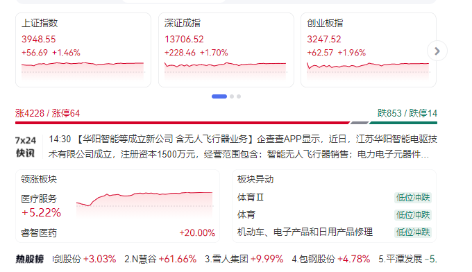 4月1日消息,市场集体反弹,三大指数均涨超1%,科创50指数涨超3%。截至收盘,沪指报3948.55点,涨1.46%,深成指报13706.52点,涨1.70%,创指报3247.52点,涨1.96%。
