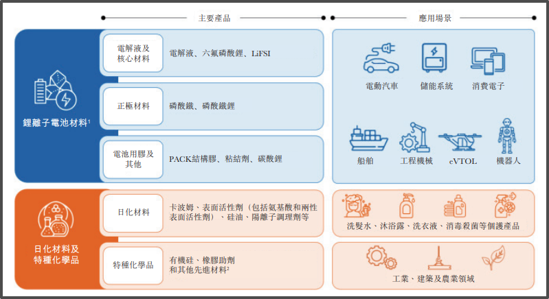 天赐材料主要业务分为锂离子电池材料、日化材料及特种化学品两大板块,其围绕锂、氟、磷、硫四大主要化学元素为核心,进行化合物及聚合物基础研究和材料合成研发。