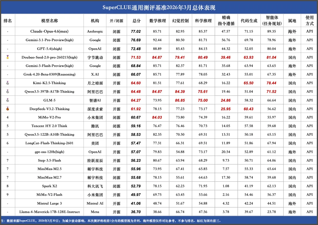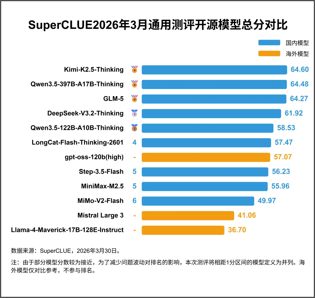 Super CLUE的3月最新测评中,开源榜单前列均为国内模型。其中,Kimi-K2.5-Thinking(64.60),Qwen3.5-397B-A17B-Thinking(64.48)与智谱GLM-5(64.27)并列开源第一,领先海外开源模型gpt-oss-120b(high)(57.07)超过7分,优势明显。盘古并未进入前列。