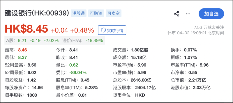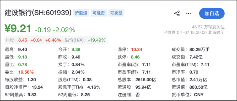 截至4月7日收盘,建行A股报9.21元/股,跌幅2.02%,总市值2.41万亿元;港股走势则呈现分化,开盘下跌,午市过后逐步回升,收于8.45元/股,涨0.48%,总市值2.21万亿元。