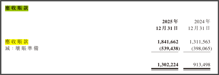 财报显示,2025年优必选总营收达到20.01亿元,同比增长53.3%,位居全球人形机器人公司之首;全年净亏损7.9亿元,同比减亏31.9%。虽然亏损逐步收窄,但过去四年优必选累计亏损已经超过42亿元。同时,公司的应收账款规模也处于高位,截至2025年末,优必选应收账款高达18.42亿元,同比增长40%,其中由于相关客户回款延迟,坏账准备计提达5.39亿元。