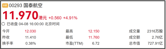 截至4月8日下午收盘,国泰航空股价为11.97港元/股,上涨约4.91%。