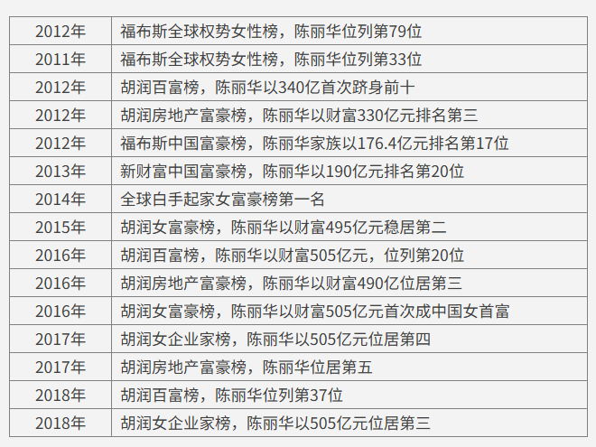 2016年胡润女富豪榜,陈丽华以财富505亿元首次成中国女首富。2018年的胡润女企业家榜,陈丽华以505亿元位居第三。