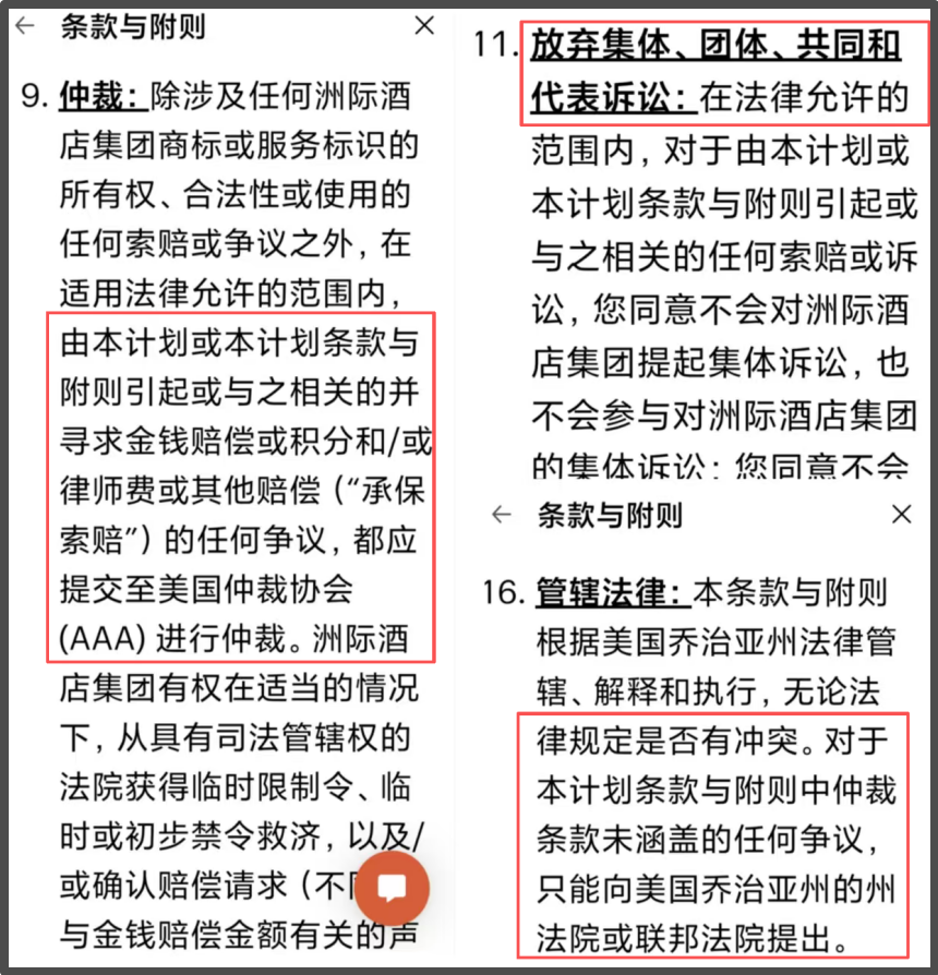 具体而言,洲际酒店会员条款第9、11、16项规定,涉及会员计划相关的金钱赔偿等争议,需提交美国仲裁协会仲裁,放弃在法院申诉、行政诉讼等权利,且不得集体、团体、共同和代表诉讼。同时,会员条款强行规定其解释与执行适用美国乔治亚州法律,未纳入仲裁的争议亦只能向该州法院提起诉讼。