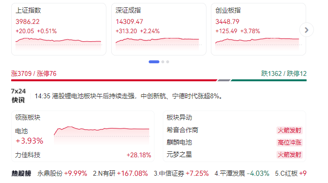 板块方面,电池产业链集体爆发,欣旺达涨超14%,圣阳股份、国轩高科、雄韬股份等多股涨停;大金融板块集体活跃,中信证券涨超7%;存储芯片概念涨幅居前,德明利涨停,总市值突破1000亿;算力硬件概念股活跃,东山精密涨停,新易盛、中际旭创涨超5%,均创历史新高;下跌方面,贵金属板块震荡调整,招金黄金领跌;航运板块持续走低,中远海能、招商南油领跌;猪肉板块下挫,巨星农牧(17.000, -0.54, -3.08%)领跌。总体来看,两市个股呈普涨态势,上涨个股超3900只。
