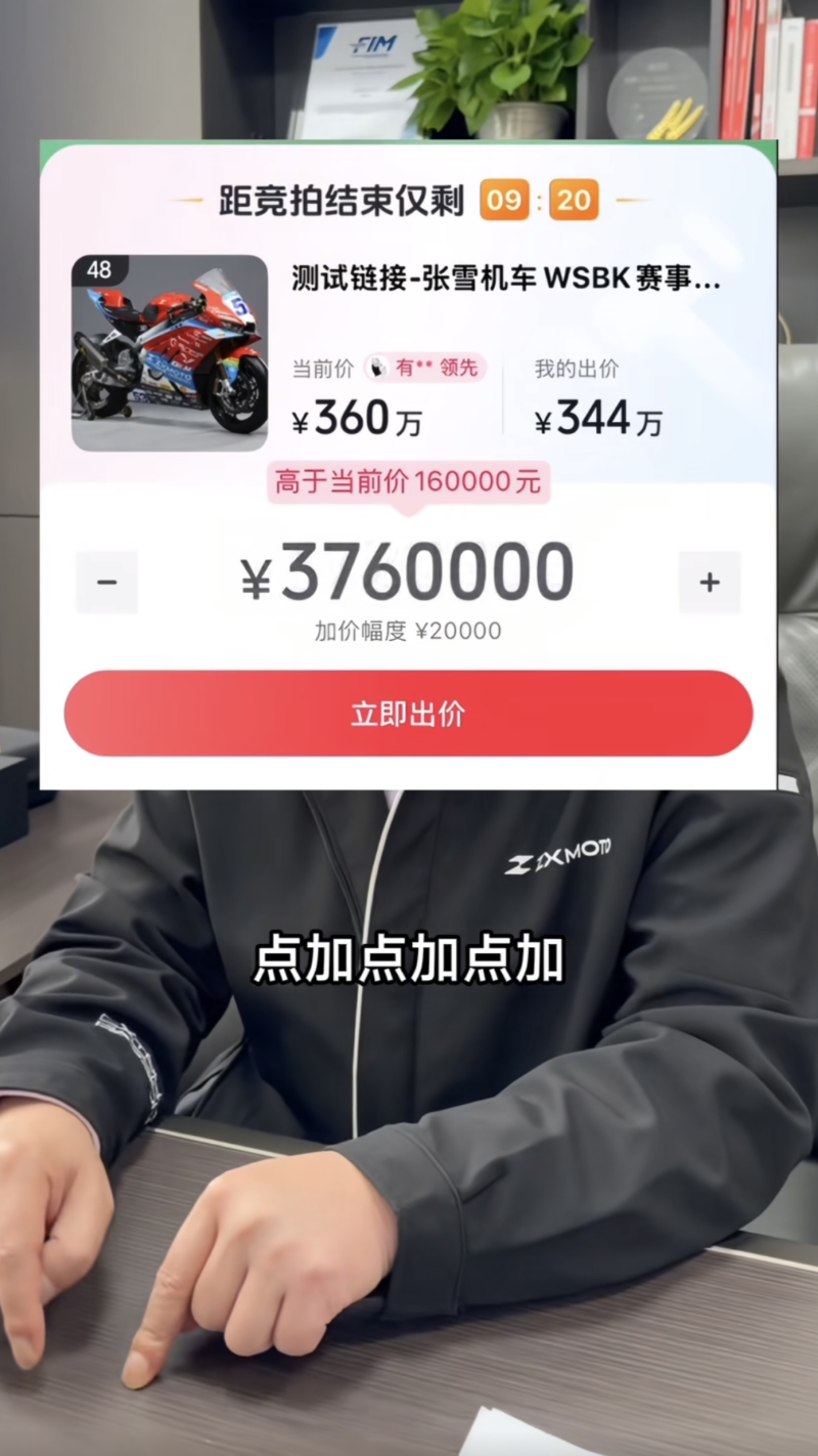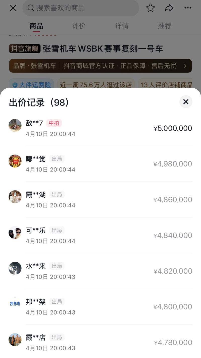 4月10日晚8时,张雪机车账号开启直播,开始拍卖WSBK夺冠车53号复刻版,据10日中午,张雪机车账号发布视频表示,此次拍卖夺冠车型复刻版,设置拍卖金额上限500万元。但竞拍者不能一次性出价到500万,在加价到100万以后,单次只能加价固定金额,因此谁能最先触达封顶价有一定的运气成分。