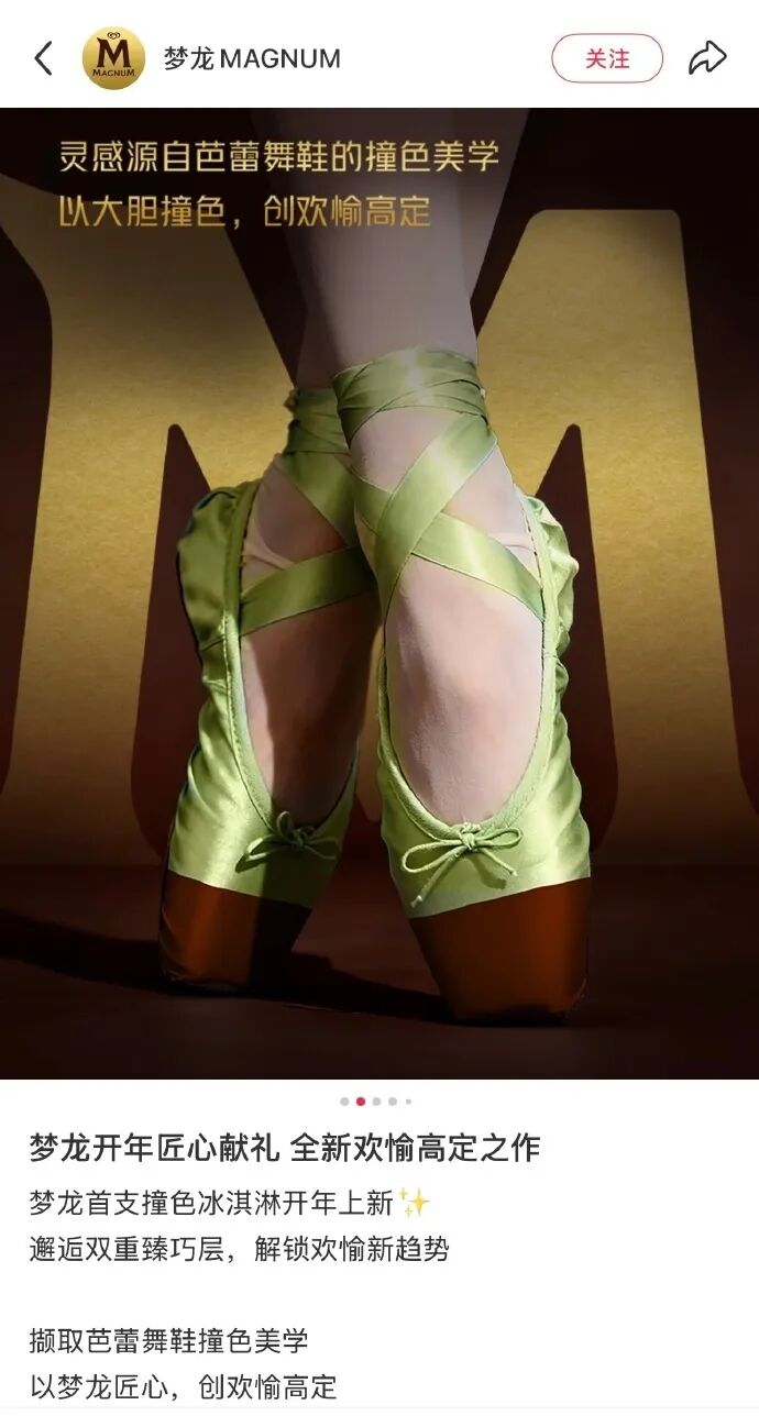 近日,不少网友注意到梦龙冰淇淋在某社交平台发布的一则开心果新品广告,其宣传物料中以“灵感源自芭蕾舞鞋的撞色美学”为主题,将芭蕾舞鞋的配色设计与冰淇淋外观关联。部分消费者认为这种联想令人不适,质疑内容涉嫌物化女性。话题“梦龙广告 芭蕾舞鞋”也在4月13日迅速登上热搜。