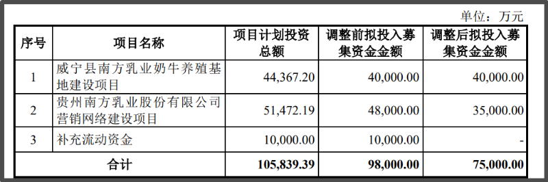 在对北交所的回复中,南方乳业表示,基于该公司整体经营发展战略,经审慎考虑和研究,调减了本次发行上市的募集资金总额,即取消补充流动资金项目并减少营销网络建设项目的募集资金投资金额,调减后的募集资金总额变更为7.5亿元。