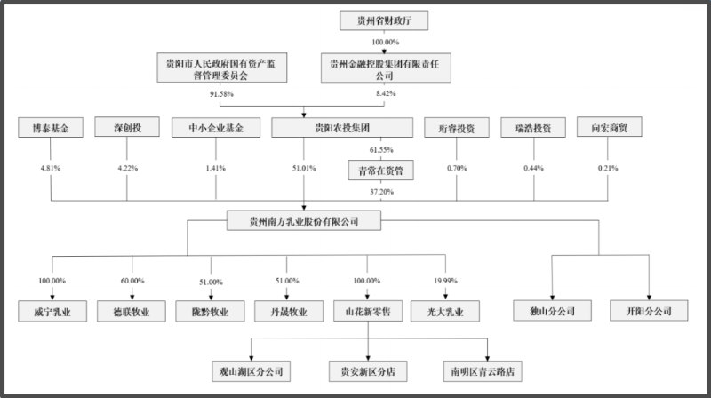 从股权结构看,贵阳农投集团所属的贵阳市国资委是南方乳业的实际控制人。贵阳农投集团合计控制南方乳业88.21%的股权,是分红资金的主要流入对象。