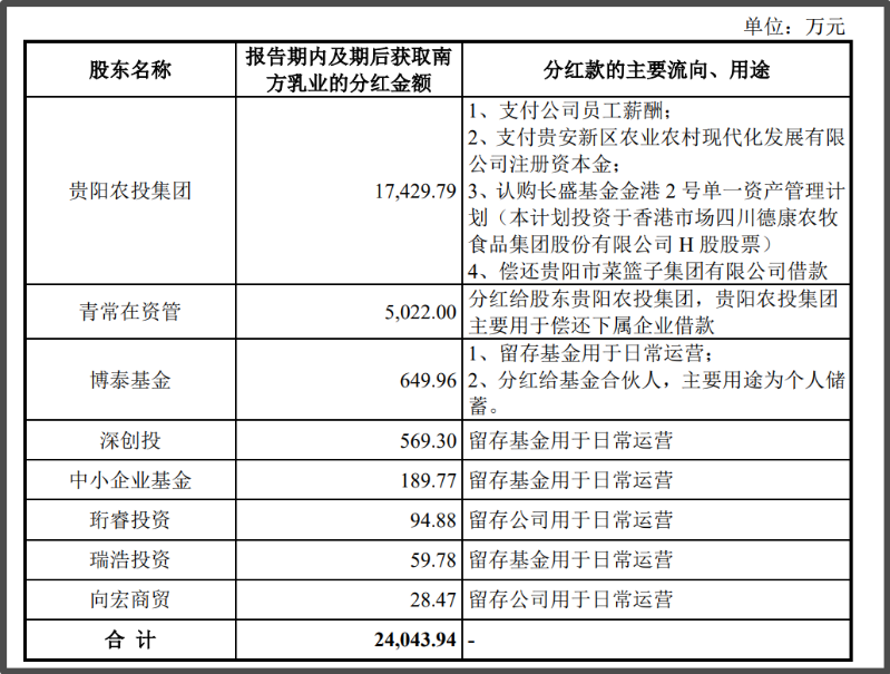 南方乳业在回复中解释称,经核查,除贵阳农投集团、青常在资管自身系南方乳业部分客户及供应商的关联方外,报告期内各股东取得分红款后,不存在将相关分红款流入南方乳业客户及其关联方、供应商及其关联方、公司员工的情形,也不存在为南方乳业分担成本费用或其他资金体外循环等情况。