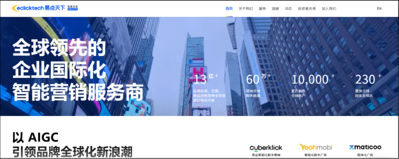 招股书显示,易点天下是一家专注于助力“中国企业出海”的数字营销服务提供商,已累计帮助客户实现超过13亿次商业转化,涵盖应用安装、用户注册及产品销售等场景,其长期合作伙伴包括阿里巴巴、腾讯、字节跳动、SHEIN等知名企业。按2024年总流水计算,易点天下在中国出海数字营销服务商中排名第四,市场份额5.0%;在全球市场的中国独立第三方移动广告平台中排名第三。