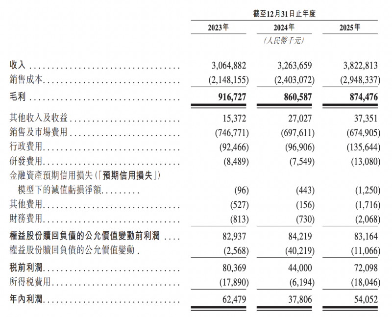 2023年至2025年,好医生云医疗收入分别为30.65亿元、32.64亿元、38.23亿元;年内利润分别为6247.9万元、3780.6万元、5405.2万元;毛利率分别为29.9%、26.4%、22.9%。