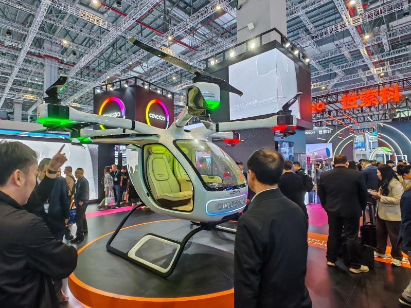 科思创今年在展会上呈现了其在飞行汽车、人形机器人、数据中心及医疗可穿戴等前沿领域的创新材料解决方案。现场一架电动垂直起降(eVTOL)飞行器颇为显眼。