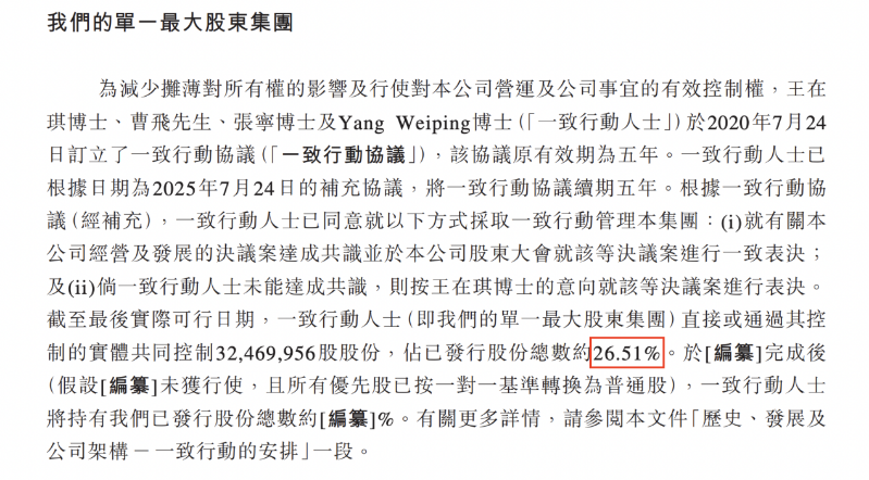 为减少摊薄对所有权的影响及行使对公司营运及公司事宜的有效控制权,王在琪、曹飞、张宁及Yang Weiping(一致行动人士)于2020年7月24日订立了一致行动协议,该协议原有效期为五年。一致行动人士已根据日期为2025年7月24日的补充协议,将一致行动协议续期五年。截至最后实际可行日期,一致行动人士(即应世生物的单一最大股东集团)直接或通过其控制的实体共同控制3247万股股份,占已发行股份总数约26.51%。