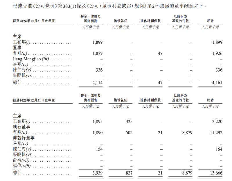 薪酬方面,2024年、2025年,王在琪酬金分别为189.9万元、222万元;曹飞酬金分别为192.6万元、241.3万元(不计算以股份为基础的付款)。可见,2025年,王在琪酬金同比增长16.90%,曹飞酬金同比增长25.29%。