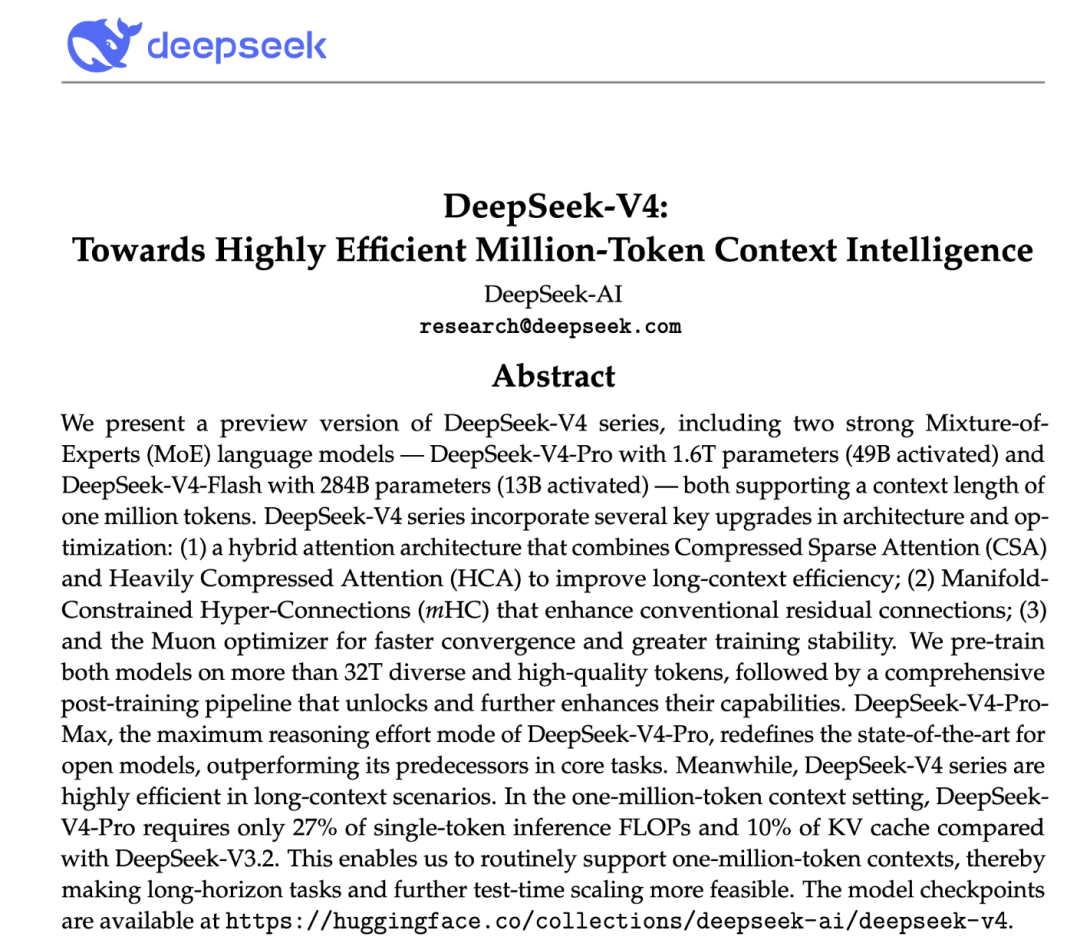 相比 DeepSeek‑V3 架构,DeepSeek‑V4 系列保留 DeepSeekMoE 框架与多令牌预测(MTP)策略,并引入多项关键架构与优化创新:混合注意力架构大幅提升长上下文处理效率,流形约束超连接(mHC)增强了传统残差连接,提升信号传播稳定性,而Muon 优化器加快收敛速度,提升训练稳定性。