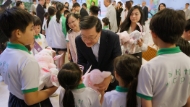 香港特首李家超与两局长到访九龙城区一间小学,与同学们一起迎接复活节假期来临,顺道视察该校正推行的“在校课后托管服务计划”。