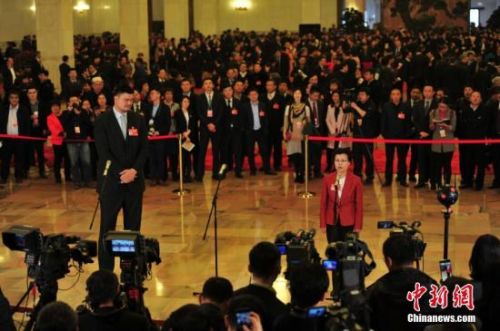 3月9日,全国政协十三届二次会议在北京人民大会堂举行第二次全体会议。图为全国政协委员王艳霞(右)、姚明(左)在“委员通道”接受采访。中新社记者 于海洋 摄