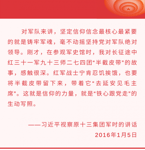 2016年1月5日,习主席视察原13集团军,当听到“半截皮带”的故事时,习主席深有感触地说:“这就是信仰的力量,就是‘铁心跟党走’的生动写照。”