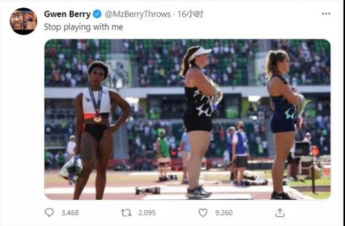 当地时间26日,在俄勒冈州尤金市举行的东京奥运会选拔赛颁奖典礼上,美国女子链球黑人运动员格温·贝瑞(Gwen Berry)获得铜牌。当美国国歌奏响时,站在领奖台上的她厌恶地转过了身,不愿面向国旗。