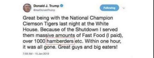 当然,特朗普自己在任的时候,也不是没出过错。2019年,特朗普就曾将“汉堡”一词拼错。