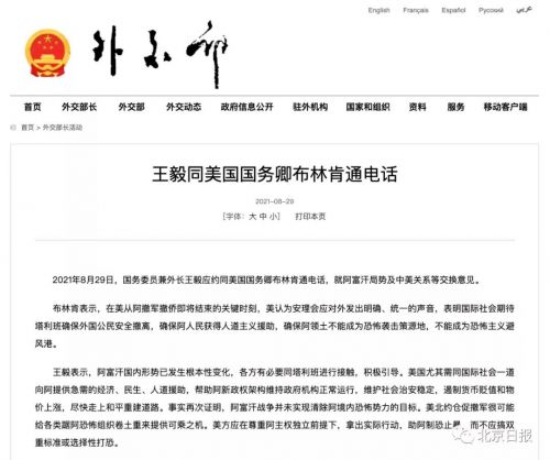 2021年8月29日,国务委员兼外长王毅应约同美国国务卿布林肯通电话,就阿富汗局势及中美关系等交换意见。